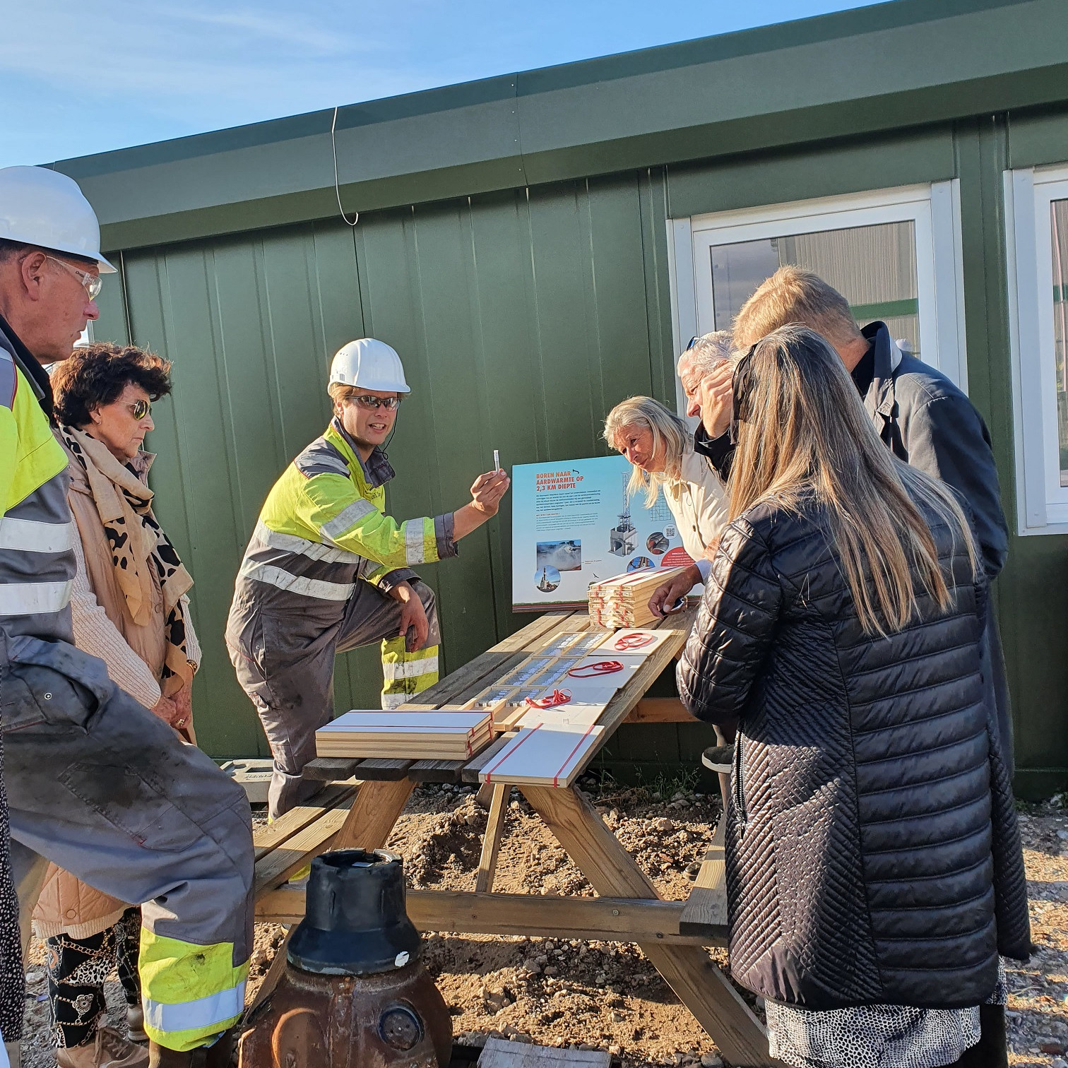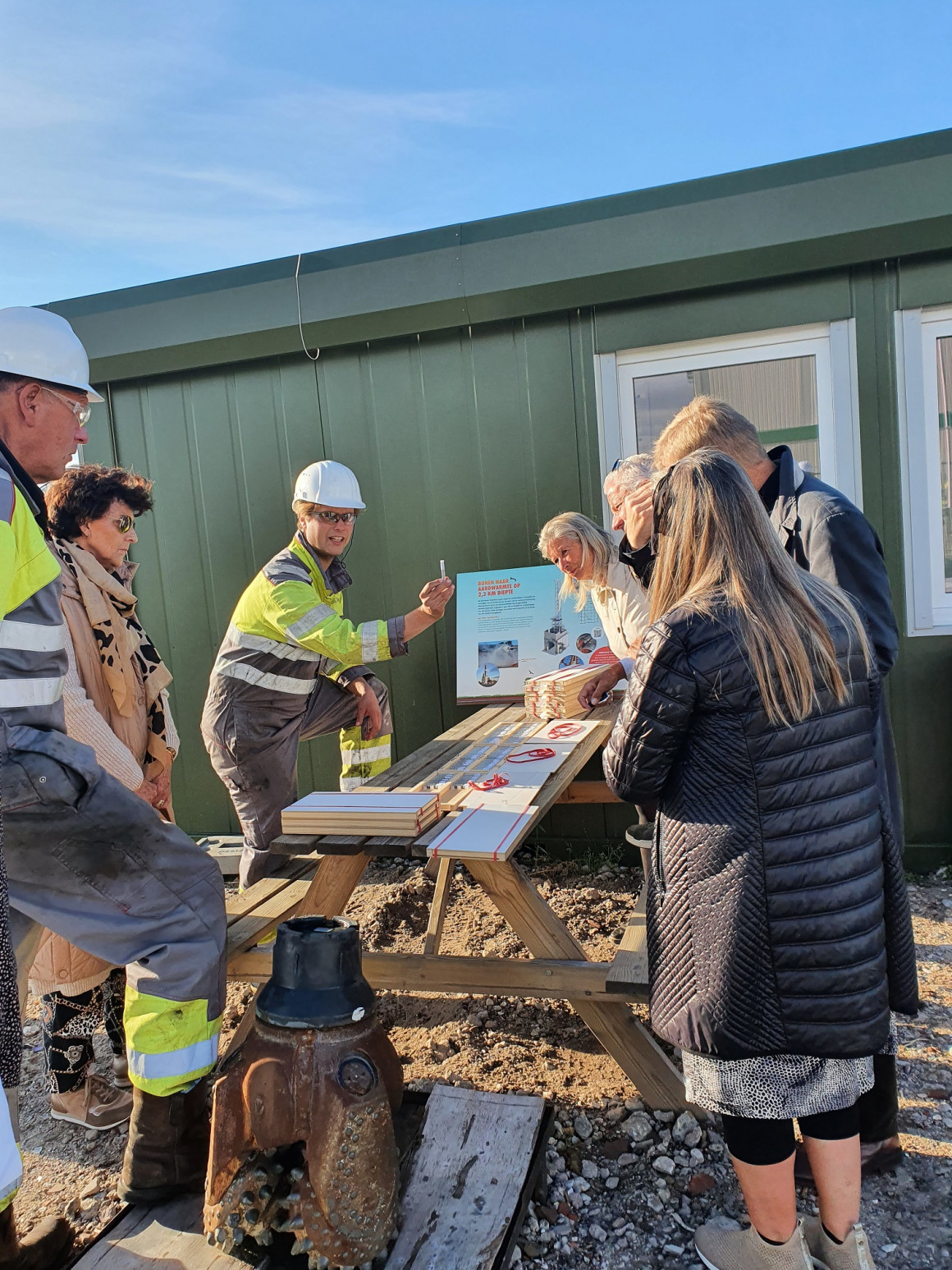 Op 29 september bracht een groepje direct omwonenden van de projectlocatie van Aardwarmte Polanen een bezoek aan de boorlocatie Maasdijk. Van boormanager Gerrit Schurink en geothermie ingenieur Axel Sanden, werkzaam bij van HVC, kregen zij uitleg over het boorproces. Daarbij werden de grondmonsters getoond die op een diepte van 3000 meter naar boven zijn gehaald. Uit de grondmonsters is af te leiden of er tot de juiste laag is geboord (Delft zandsteen) waardoor het warme aardwarmte-water stroomt.